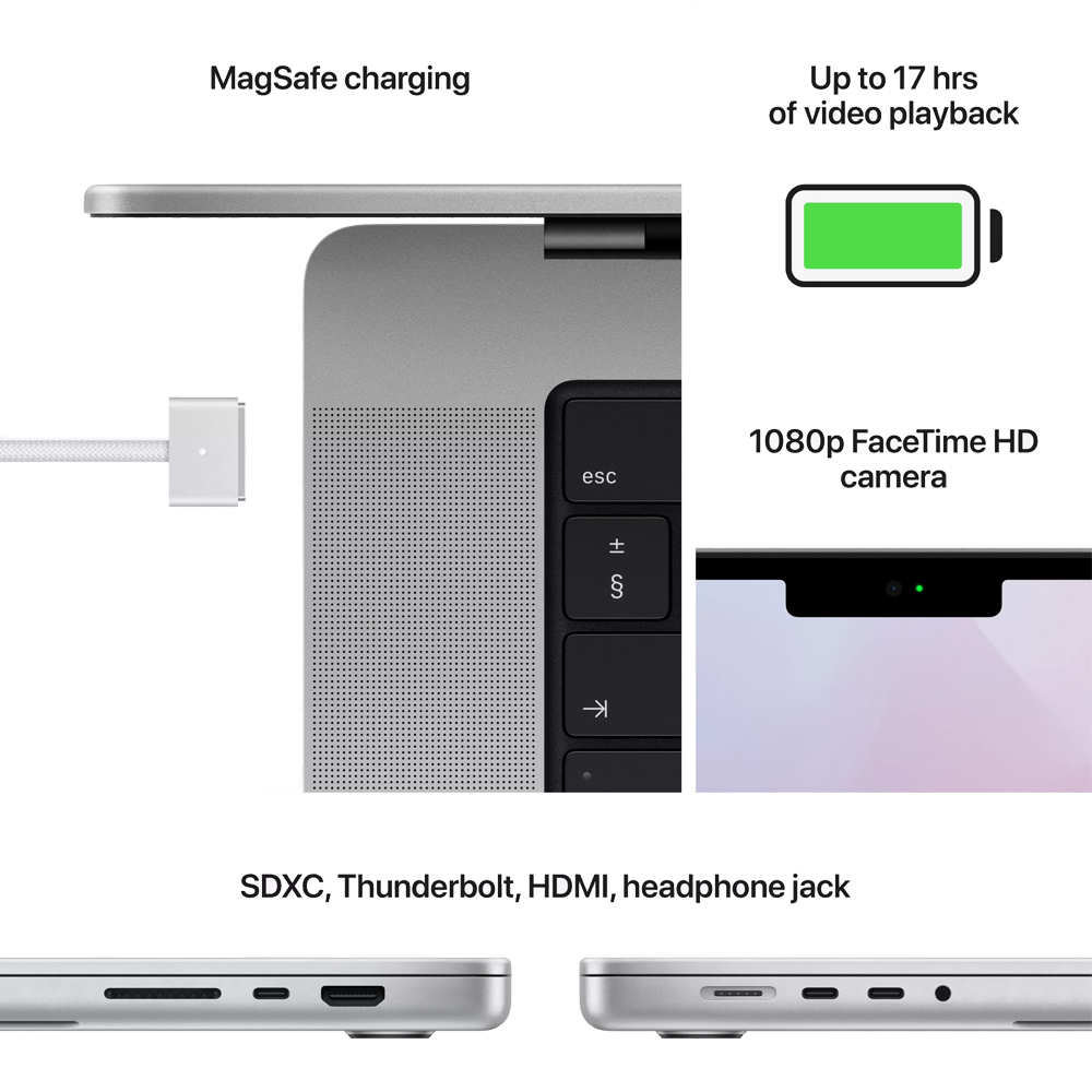 Transfer photos and videos with an SDXC card reader. Connect to TVs or displays with an HDMI output. Listen using a 3.5mm headphone jack that detects and automatically adjusts for high-impedance headphones. Connect to high-speed peripherals or displays with three Thunderbolt 4 ports. And fast-charge using the quick‑releasing MagSafe 3 port.